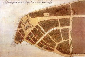 Figure 3.5 The Castello Plan is the only extant map of 1660 New Amsterdam (present-day New York City). The line with spikes on the right side of the colony is the northeastern wall for which Wall Street was named.